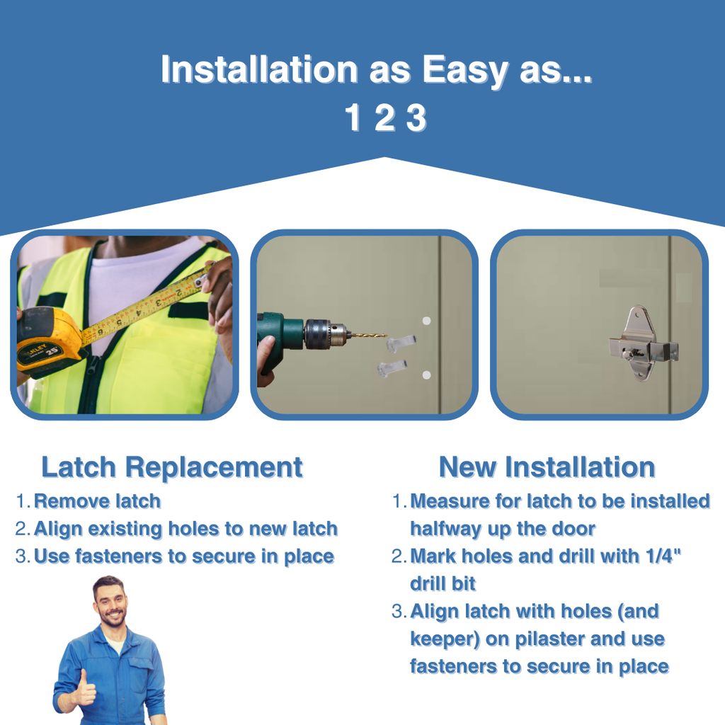 A bathroom door surface mount slide latch is a practical and space-saving hardware solution designed for securing bathroom doors. It features a sleek, compact latch mechanism that is mounted directly on the surface of the door, making it easy to install without the need for intricate door modifications. Made from durable materials like stainless steel, the slide latch ensures smooth operation with a simple sliding action to engage and disengage the latch. It provides a secure closure, ideal for bathroom privacy, and is used in combination with a matching catch or strike plate. Its minimalistic design complements various interior styles, offering both functionality and a clean aesthetic. Perfect for doors with limited space, this latch is commonly found in bathrooms, closets, or utility rooms.  Perfect for public restroom use as it is manufactured for high traffic areas.